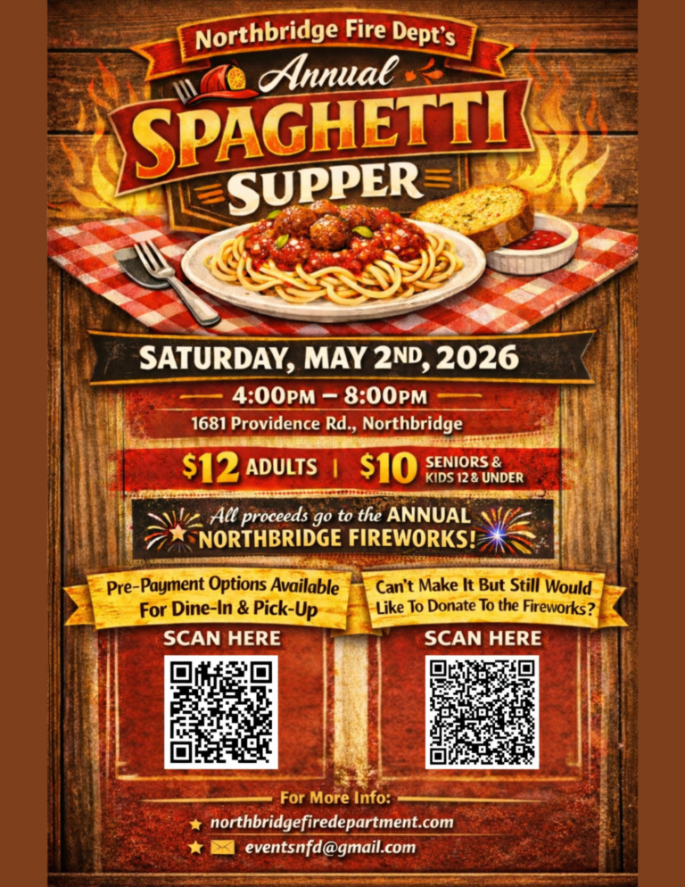 The Northbridge Fire Department will be holding the Annual Spaghetti Supper on Saturday May 2nd at the NEW Northbridge Fire Station located at 1681 Providence Rd.